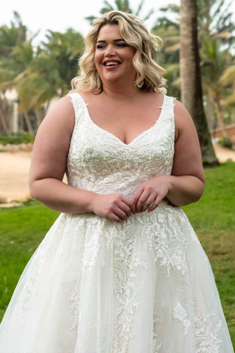 Unser Geschäft bietet eine große Auswahl an Brautkleidern in verschiedenen Größen und Stilen, insbesondere für kurvige Bräute.